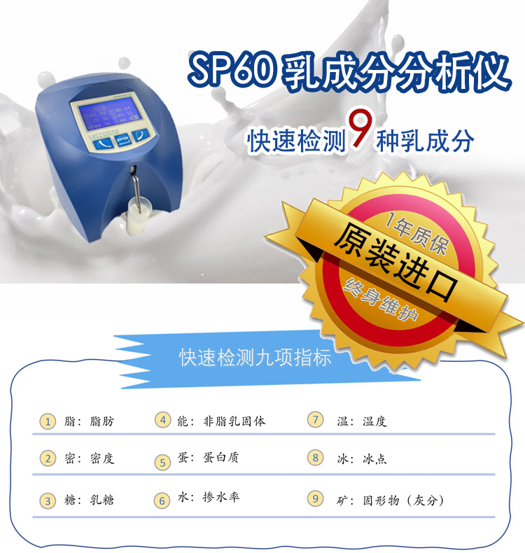 SP60乳成分分析儀, 可檢測羊奶,牛奶,巴氏滅菌奶多種奶源, 標(biāo)配檢測脂肪,蛋白,摻水率等九項(xiàng)乳成分。